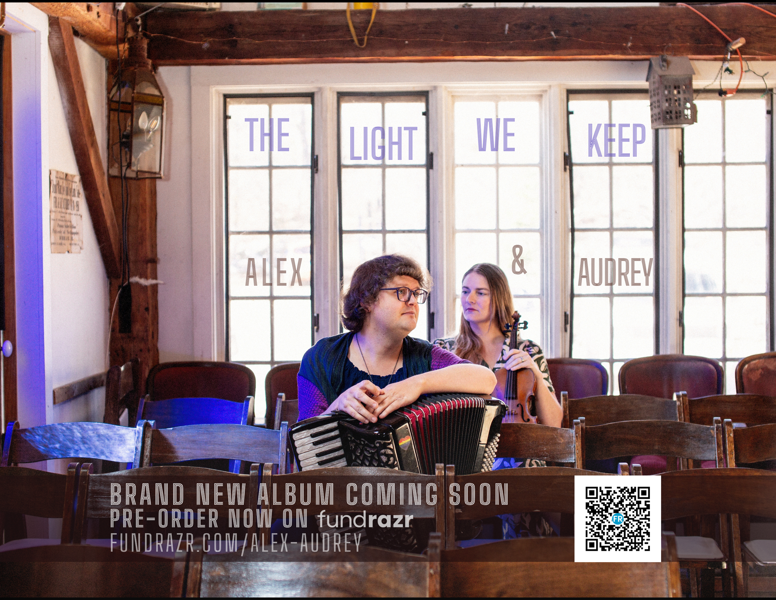 Together, Alex and Audrey create a unique and engaging traditional music experience. Their collaboration blends Alex’s traditional singing and rhythmic accordion playing with Audrey’s lively fiddling, resulting in performances that resonate deeply with audiences. Audrey played fiddle on Alex’s debut solo album, “Homecoming,” released in 2024 and the duo are working on their debut duo record in 2026.
